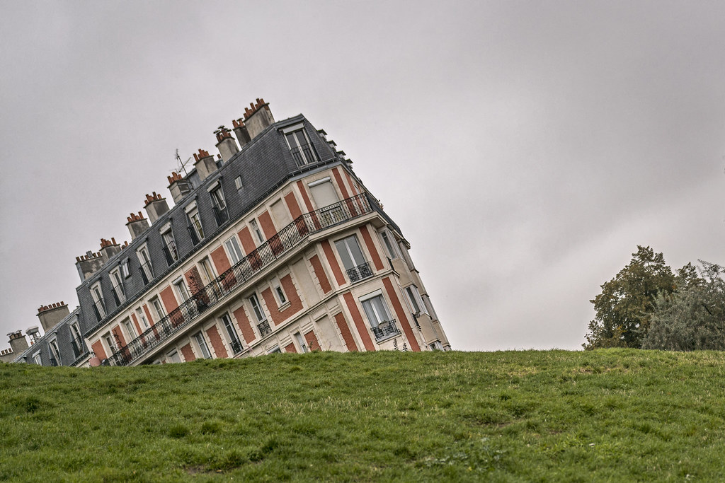 In Paris im Quartier Montmarte gibt es einen Wohnblock, der aussieht, als würde er im Boden versinken. Doch Achtung, das Haus versinkt nicht wirklich im Boden. Die Wiese nebenan ist nur schräg und wenn es auf der Kamera aussieht, als wäre die Wiese gerade, ist das Haus wiederum schräg.